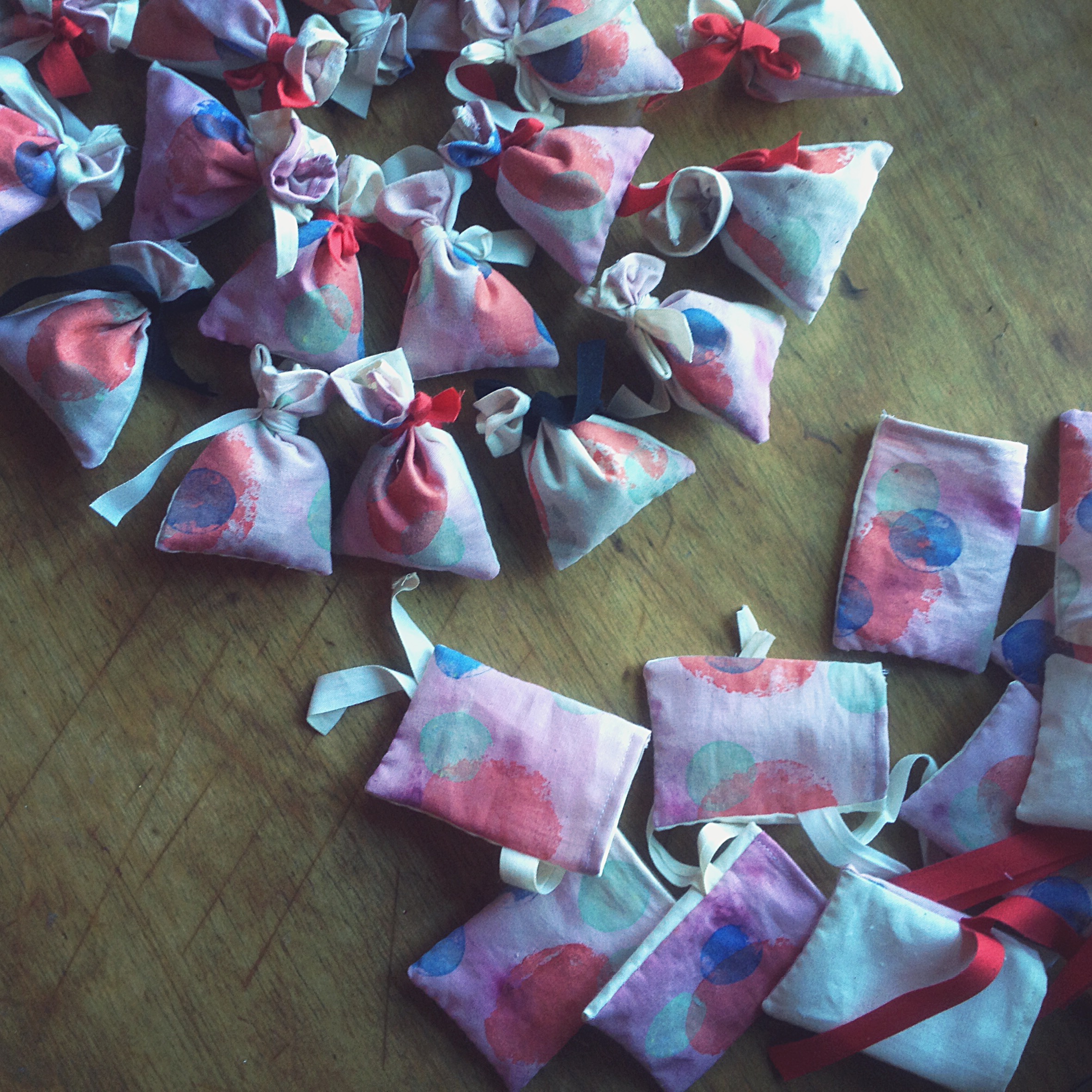 Tyg färgat med körsbär. Ekologisk tryckfärg blandad av filmjölk och pigment. Tygtryck med potatis. Lavendeln är ekologiskt odlad utanför Mariestad.
