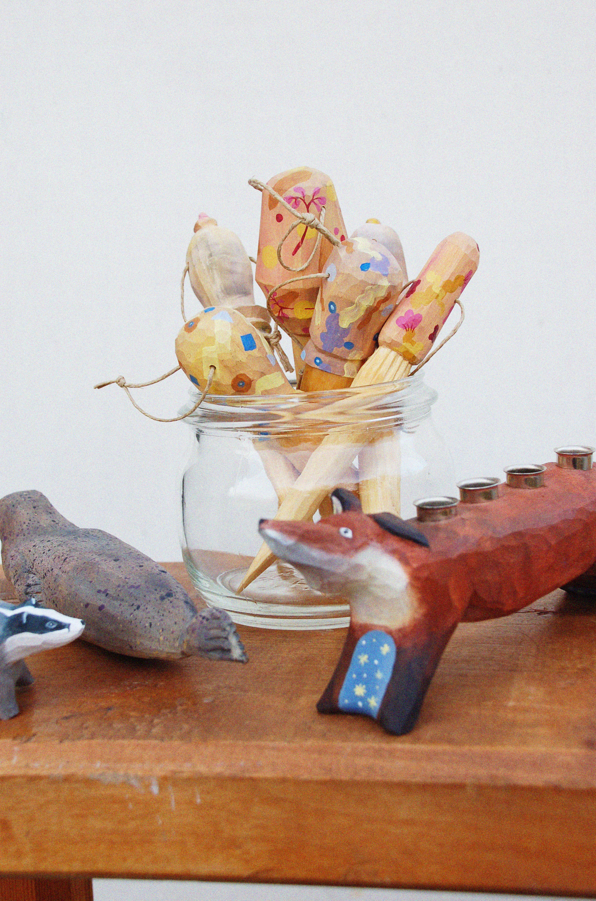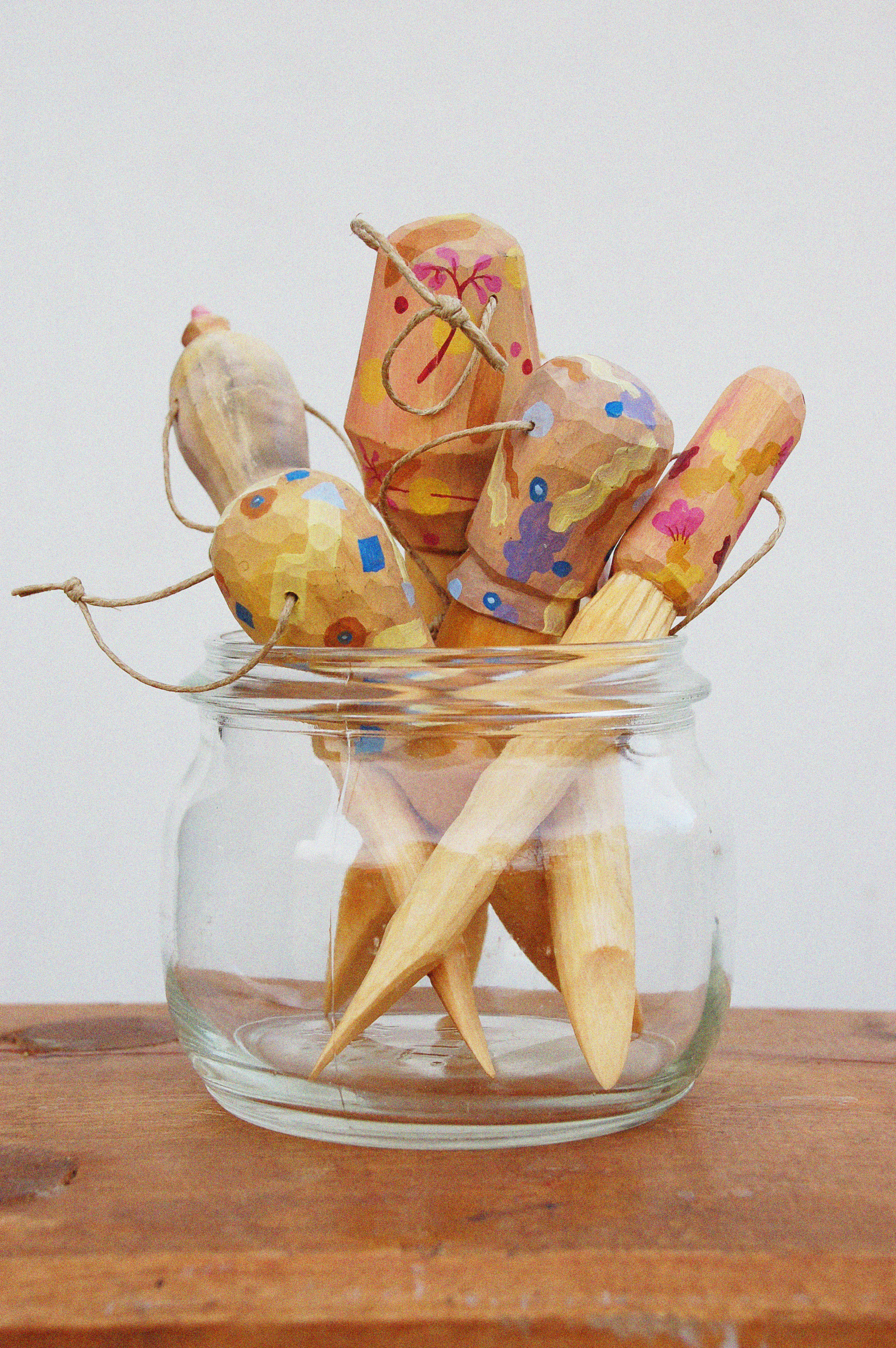 Under 2024 medverkade jag i residenset Slöjd och Skrift, VGR Kulturutveckling. Under fantastisk ledning av författaren och poeten Burcu Sahin handleddes jag och de andra deltagarna i att skriva, jämte slöjden. Under hösten 2025 släppte vi en gemensam publikation på Bokmässan i Göteborg. Jag läste då några texter ur zinet. Därefter medverkade jag på ett samtal om folkkonst. Under residenset utforskade jag bl.a den rimmade dikten som folkkonstens fröjdiga motsvarighet inom skrivandet. Dessa skulpturer är ett pågående arbete där jag kombinerar den rimmande dikten med en slöjdande praktik.